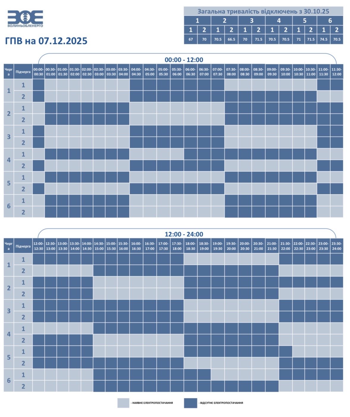 підчерга 1.2. – 00:00-00:30, 04:00-11:00, 14:30-21:30;