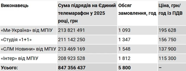 У березні з телеканалами уклали чотири угоди на створення контенту для марафону Єдині новини #UAразом в 2025 році на 738 млн гривень. Тепер їм дозамовили послуги на листопад-грудень на 109 млн гривень. Вартість нових договорів становить від 24 до 29 млн гривень.