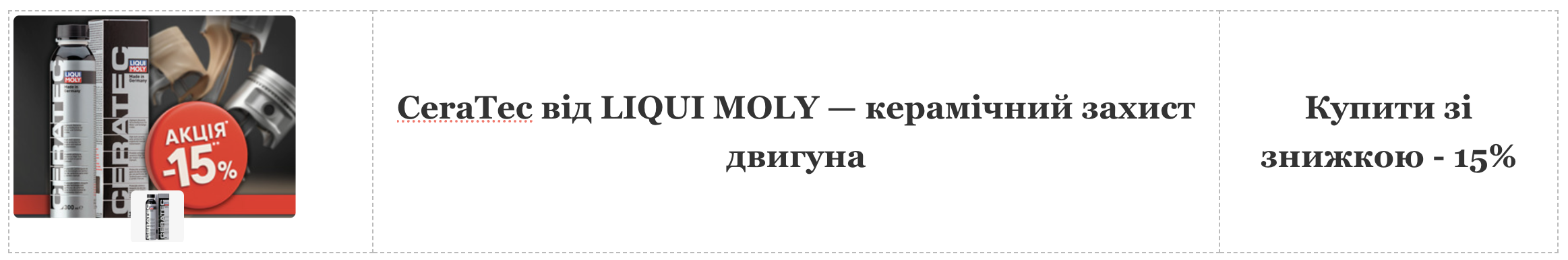 З 24.11 по 28.12.2025 у всіх офіційних точках продажу LIQUI MOLY в Україні діє сезонна пропозиція: знижка 15% на високоефективну керамічну присадку для захисту двигуна CeraTec. Це саме той продукт, який залишається на деталях після зупинки мотора, захищає від зношування в момент запуску, підвищує плавність роботи і ідеально підходить для зимових умов та коротких поїздок містом.