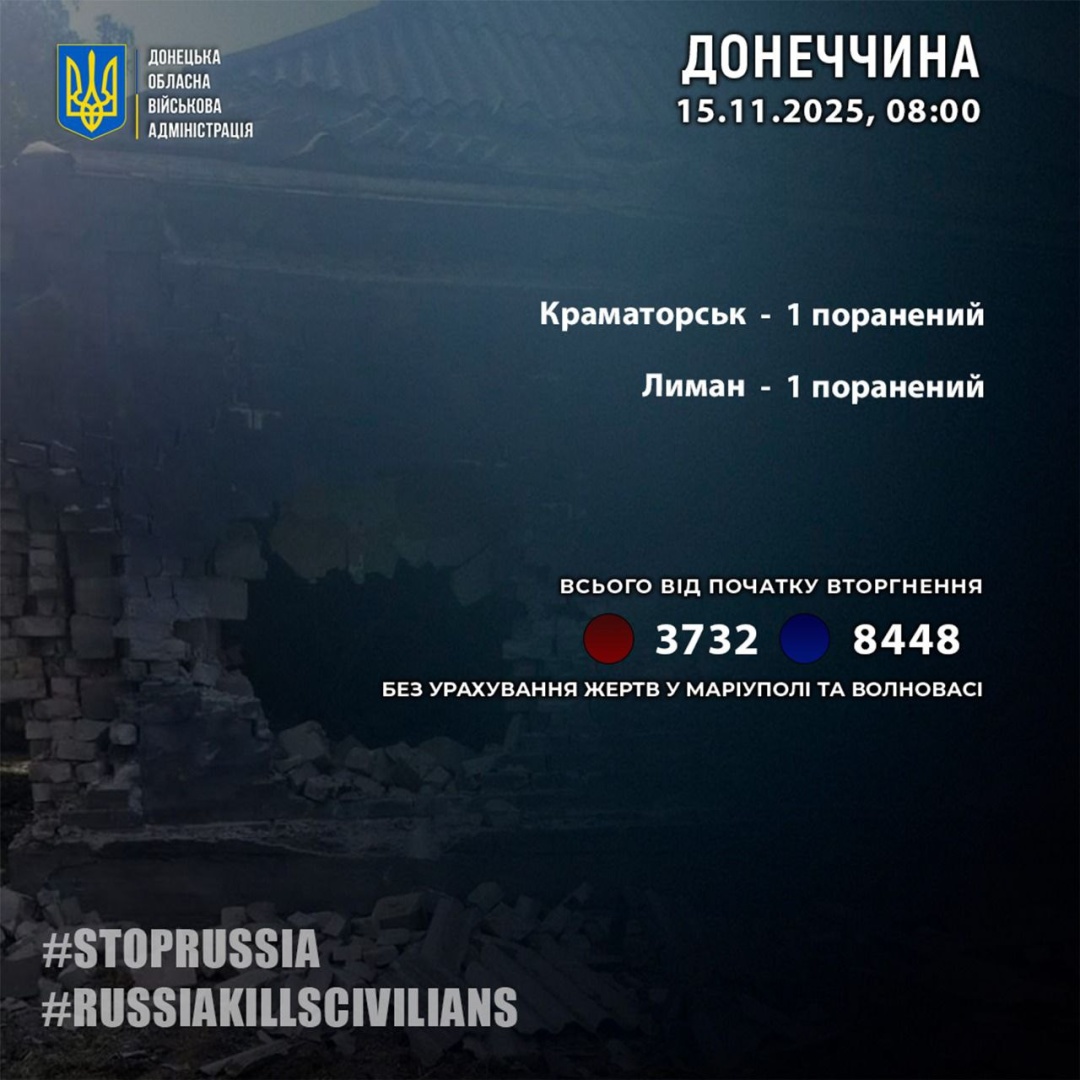 Як зазначається, за 14 листопада росіяни поранили двох жителів Донеччини - у Краматорську та Лимані.