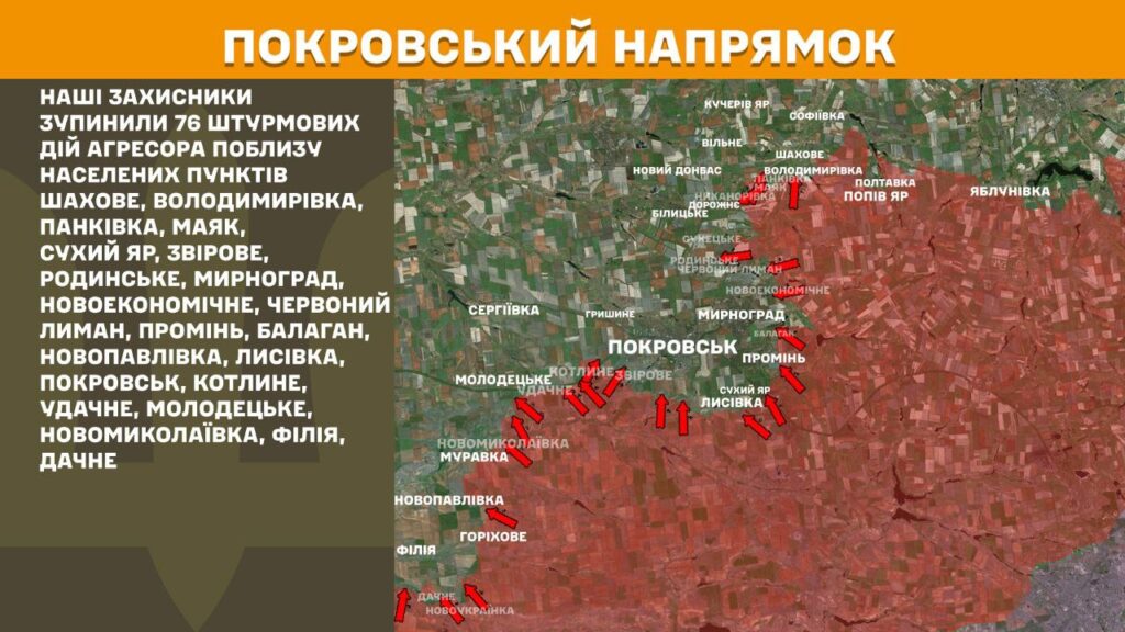 Найгарячішою точкою фронту залишається Покровський напрямок, де наші захисники зупинили 76 штурмових дій агресора. Бої точилися поблизу населених пунктів Шахове, Володимирівка, Панківка, Маяк, Сухий Яр, Звірове, Родинське, Мирноград, Новоекономічне, Червоний Лиман, Промінь, Балаган, Новопавлівка, Лисівка, Покровськ, Котлине, Удачне, Молодецьке, Новомиколаївка, Філія та Дачне.