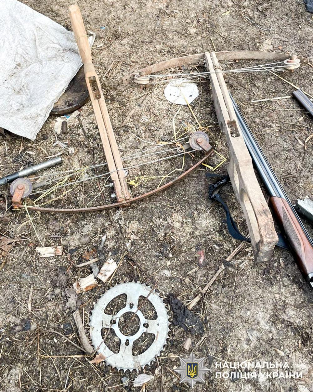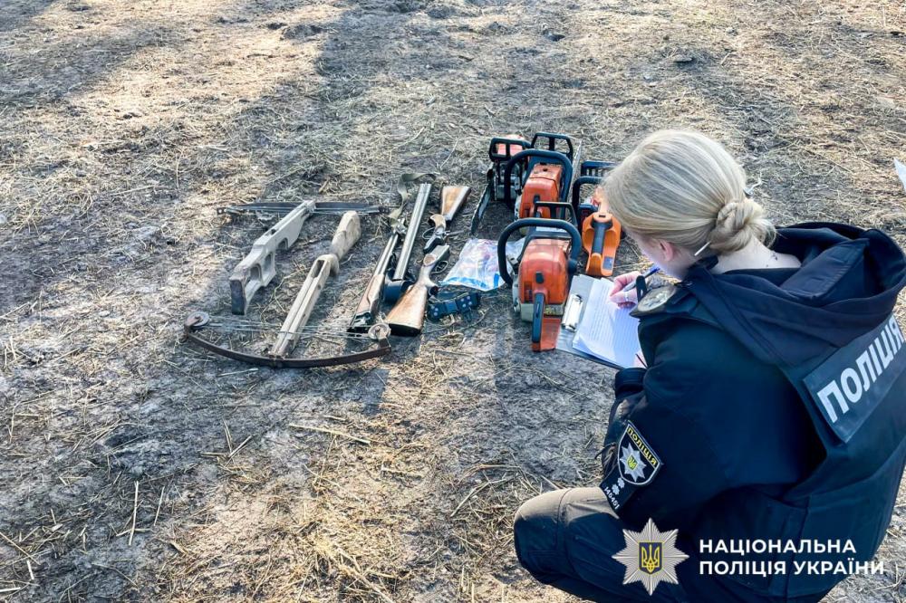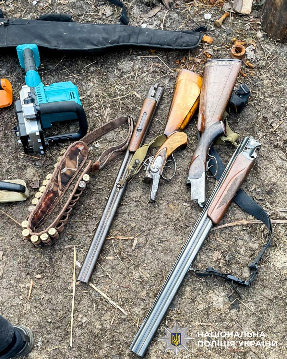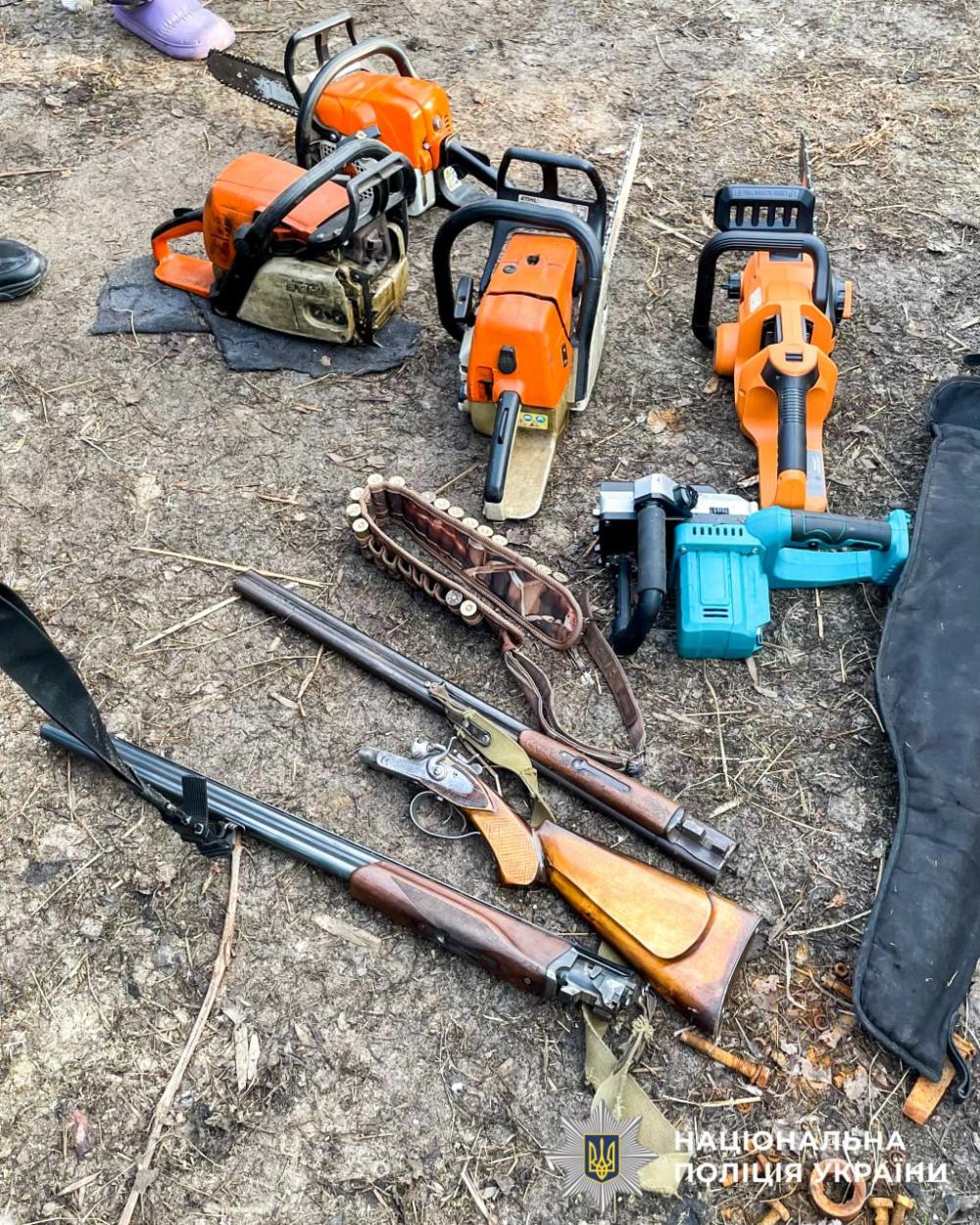 Під час санкціонованих обшуків за місцями проживання фігурантів правоохоронці виявили та вилучили 4 бензопили, 3 електропили, 2 арбалети, 2 гладкоствольні рушниці та 16 патронів до них, а також 29 колод деревини породи сосна по 2,5 метри кожна.