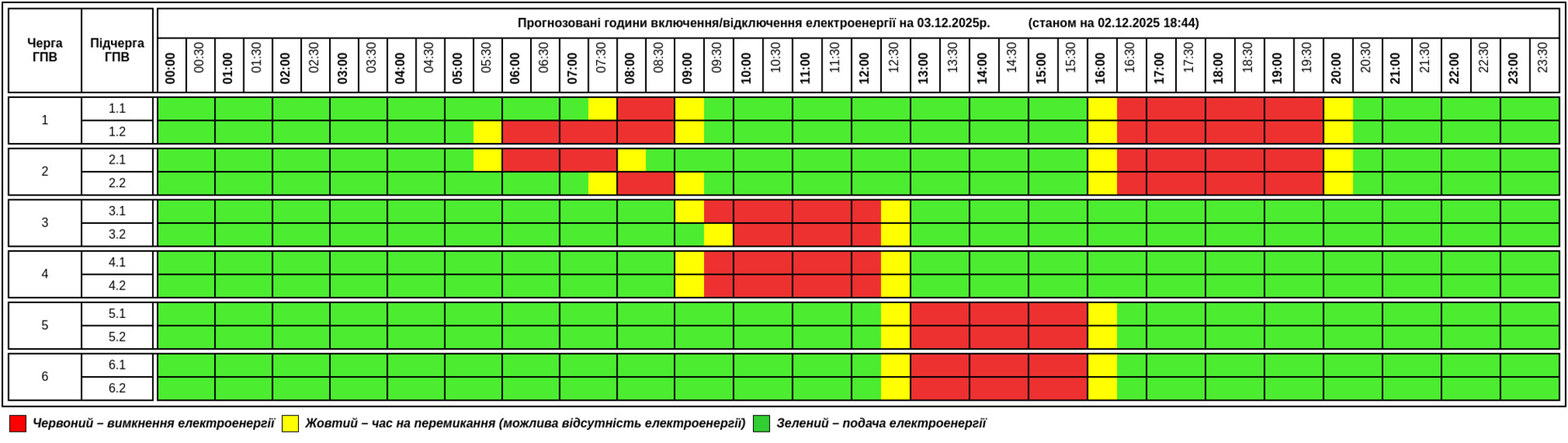 Згідно вказівки НЕК «Укренерго» 03.12.2025 на території Тернопільської області діятиме Графік погодинних відключень (ГПВ). Про це повідомили у пресслужбі «Тернопільобленерго».