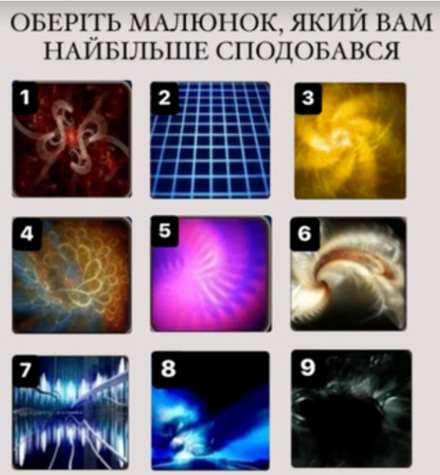 Щоб отримати результат, потрібно інтуїтивно обрати 1 із 9 картинок, що зображені нижче, та прочитати пояснення.