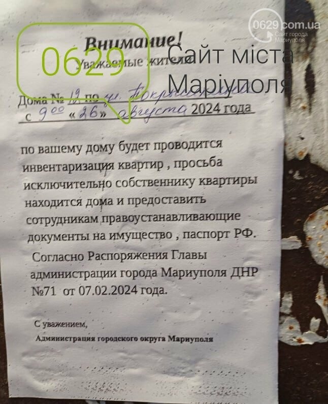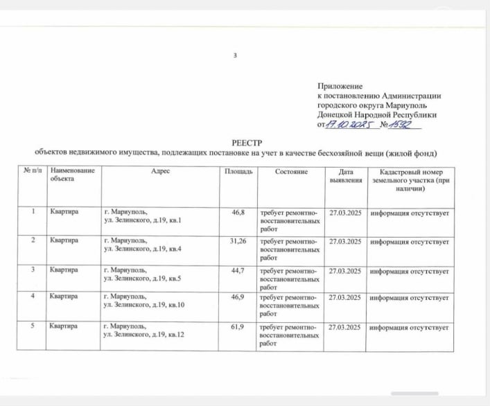 Летом 2024 года в Мариуполе появились первые большие списки такого «имущества» — почти 500 адресов. Постепенно эти списки превратились в поток документов, поступавший почти ежемесячно. По официальным данным оккупантов, по состоянию на ноябрь 2025 года более 1200 квартир в Мариуполе уже были изъяты как «бесхозные». Количество квартир, которые еще находятся на стадии изъятия, оккупанты не озвучивают.