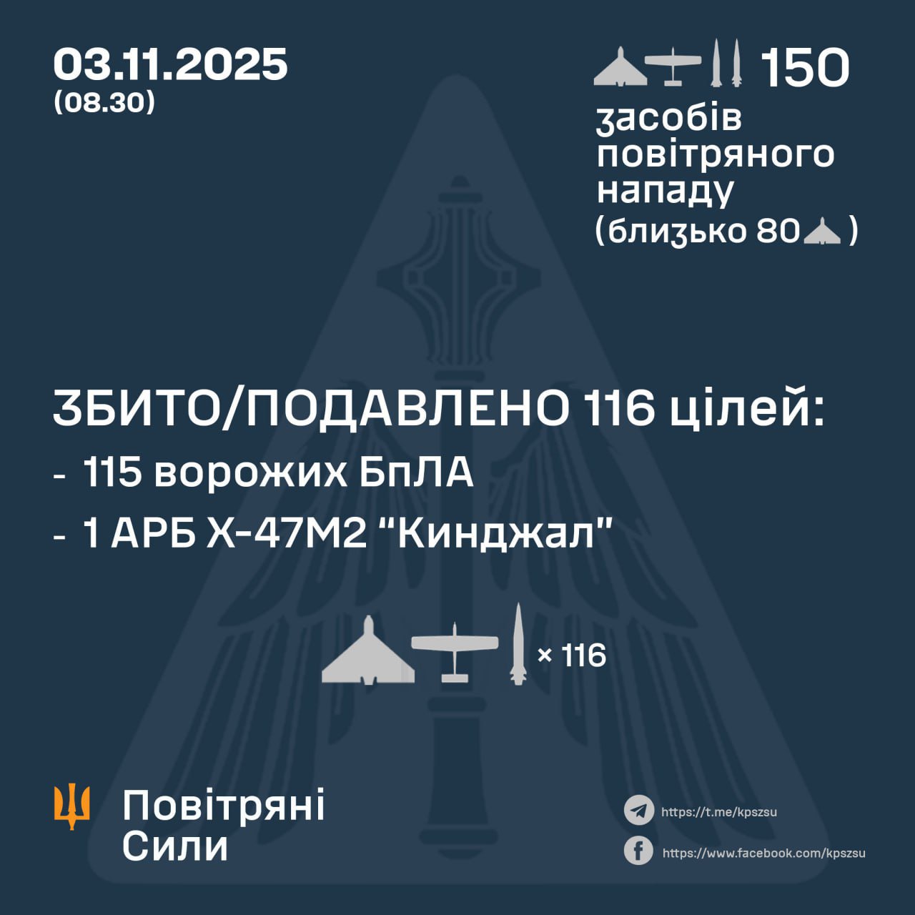 У ніч на 3 листопада сили ППО знешкодили 116 цілей ворога: одну аеробалістичну ракету "Кинджал" та 115 безпілотників. Зафіксовано влучання ракет та 20 ударних БпЛА на 11 локаціях.