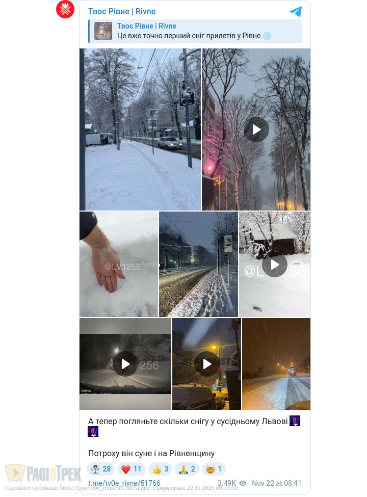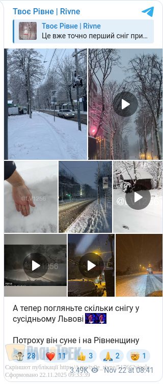 Перший сніг випав на Рівненщині. Користувачі соцмереж активно публікують фото і відео, як виглядають вулиці.