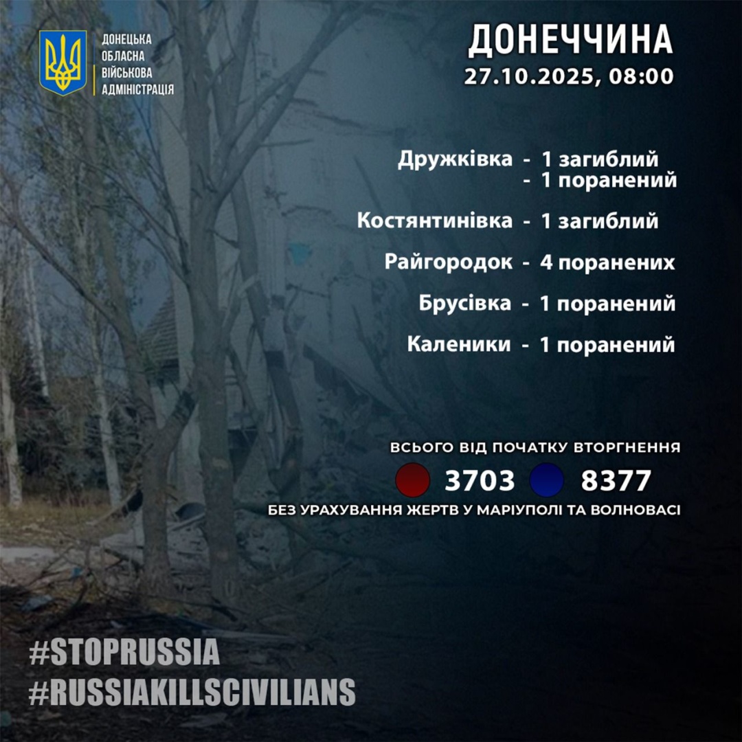 Російські загарбники минулої доби, 26 жовтня, вбили двох і завдали поранень сімом жителям Донецької області.