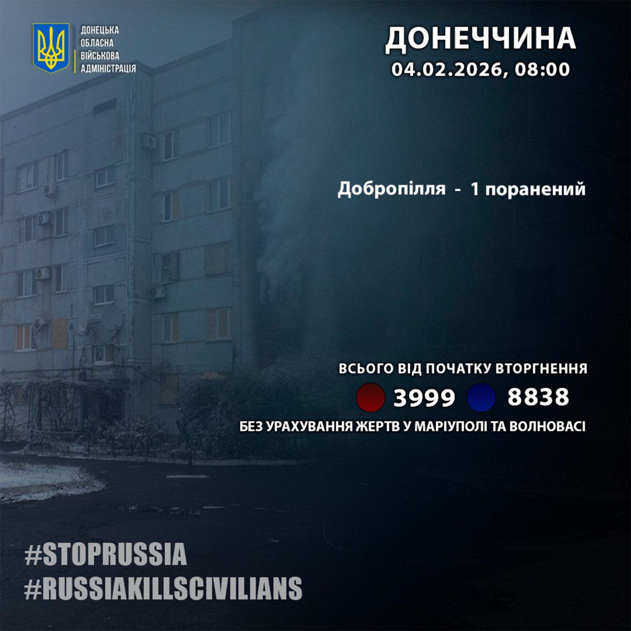 • З початку російського вторгнення в області загинуло 3999, поранення отримали 8838. Загальна кількість жертв росіян на Донеччині подана без урахування Маріуполя та Волновахи.