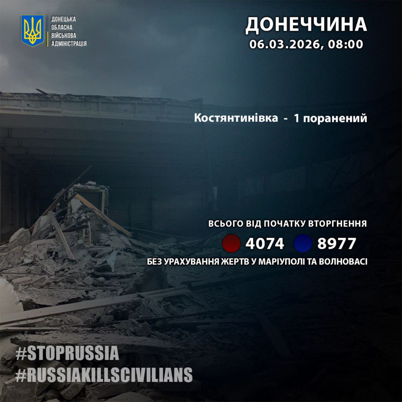 З початку вторгнення російська армія вбила у регіоні 7074, поранила 8977 осіб. Загальна кількість жертв росіян на Донеччині подана без урахування Маріуполя та Волновахи.