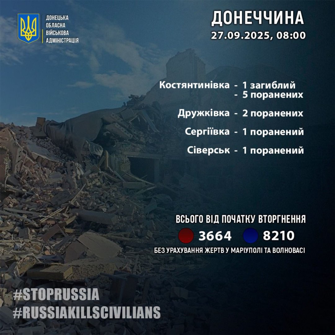 Упродовж 26 вересня росіяни вбили одного жителя Донеччини у Костянтинівці, ще дев'ятеро людей зазнали поранень.