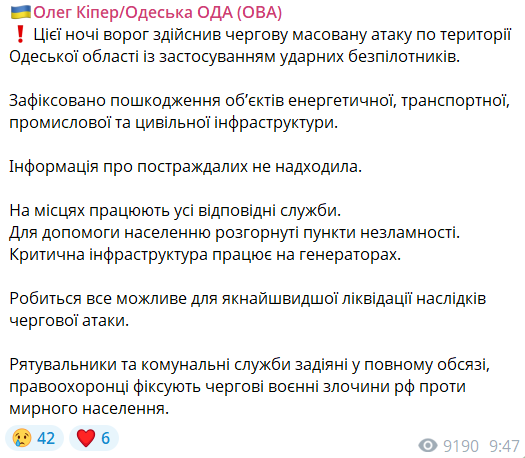 Сегодня ночью Россия нанесла второй подряд массированный удар по энергетике Одесской области с использованием ударных беспилотников.