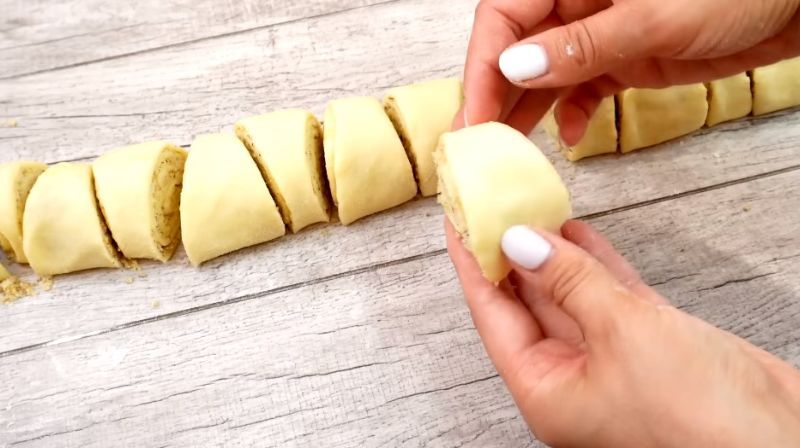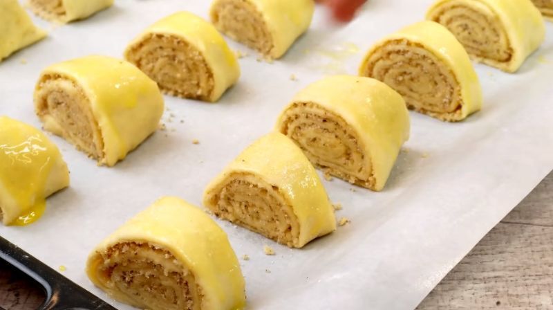 Розрізаємо рулет на шматочки й змащуємо жовтком.