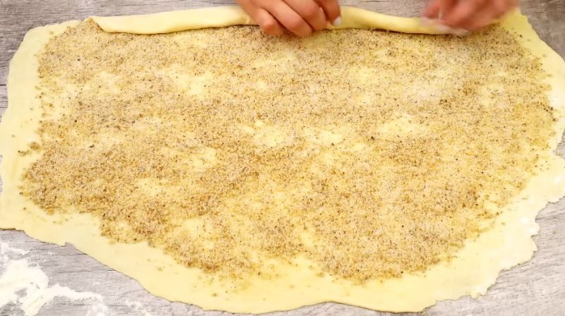 Тісто розкачуємо у тонкий пласт, посипаємо начинкою та загортаємо в рулет.