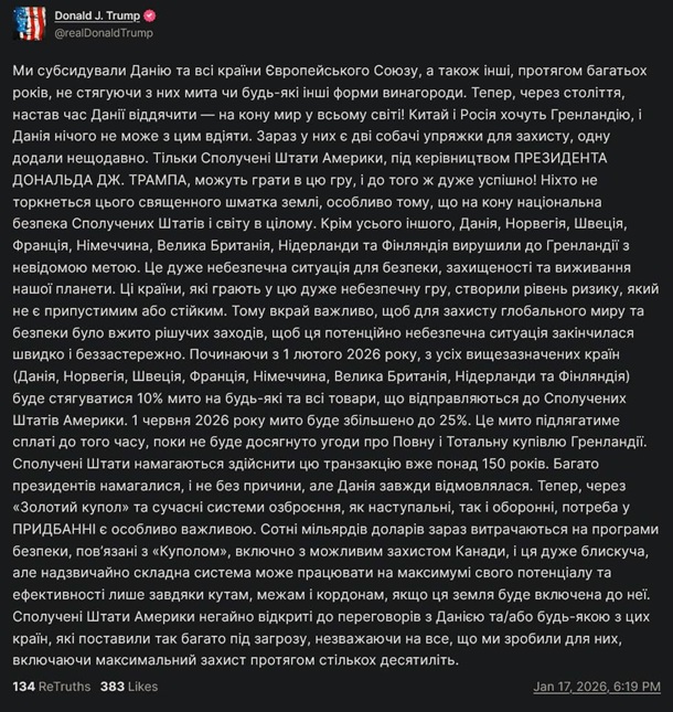 З 1 лютого Данія, Норвегія, Швеція, Франція, Німеччина, Сполучене Королівство, Нідерланди та Фінляндія сплачуватимуть 10% мита на всі товари, що постачають до США, а з 1 червня це мито підвищать до 25%, повідомив Трамп у Truth social, повідомляють ЗМІ.