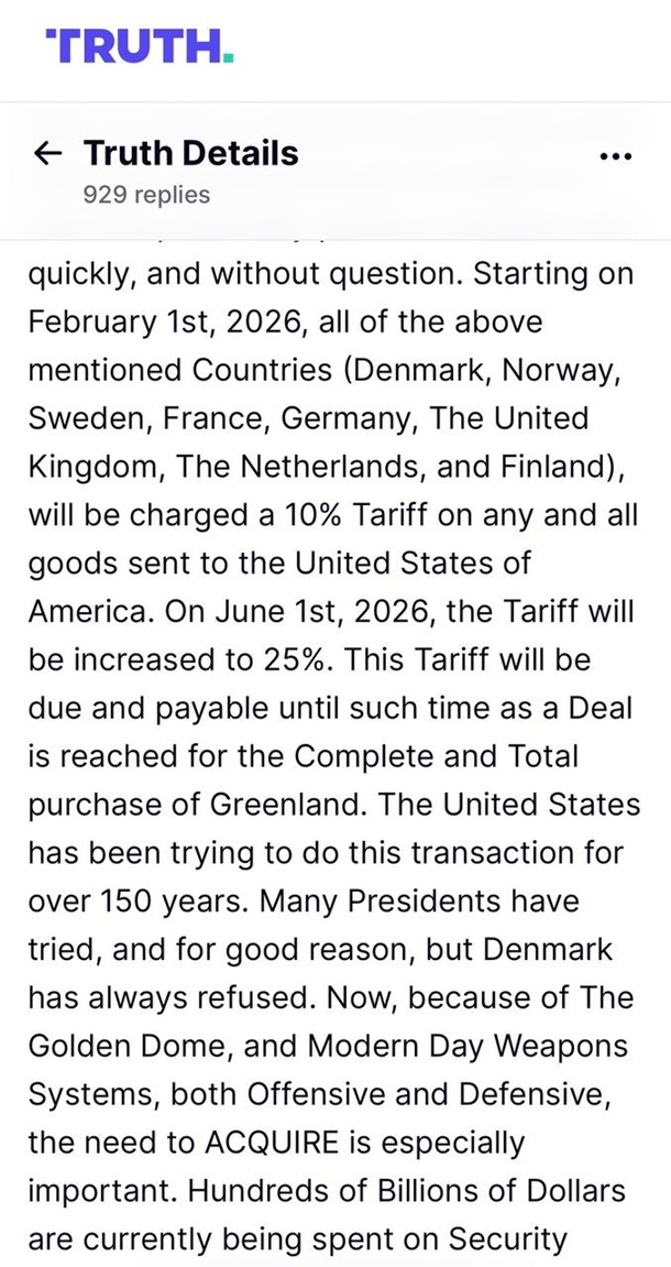 Дональд Трамп повідомив, що мита діятимуть доти, доки не буде досягнуто домовленості про "повну та остаточну купівлю Гренландії".