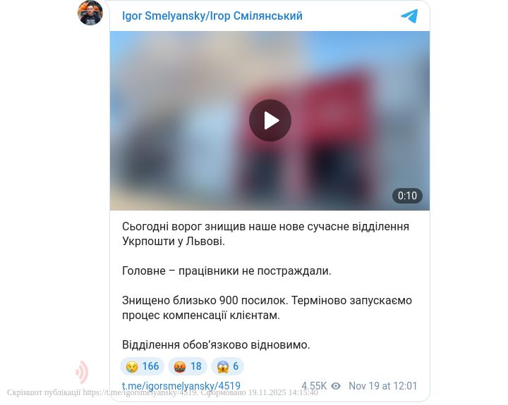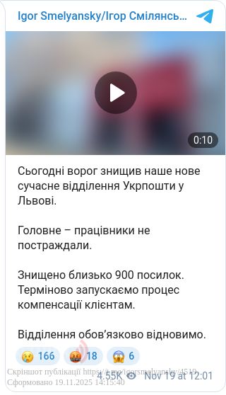 «Сьогодні ворог знищив наше нове сучасне відділення »Укрпошти« у Львові. Головне – працівники не постраждали. Знищено близько 900 посилок. Терміново запускаємо процес компенсації клієнтам. Відділення обов’язково відновимо», — зазначив Смілянський у дописі.