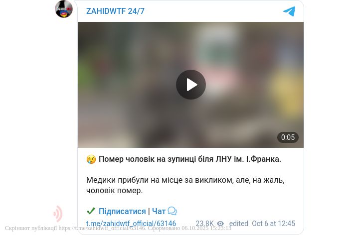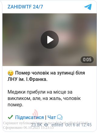 Сьогодні, 6 жовтня, у Львові на зупинці громадського транспорту, розташованій біля Львівського національного університету імені Івана Франка помер чоловік.