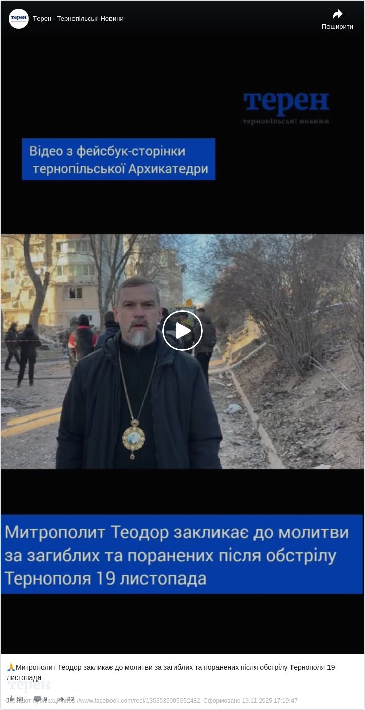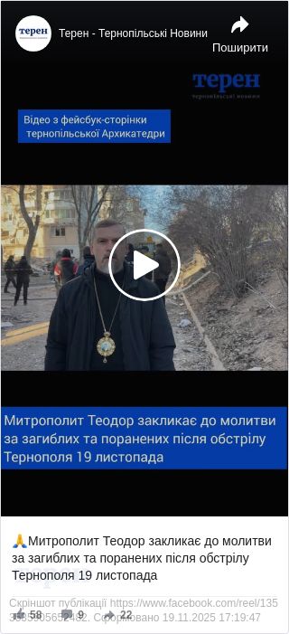 Митрополит Теодор закликав до молитви за загиблих та поранених після обстрілу Тернополя 19 листопада.