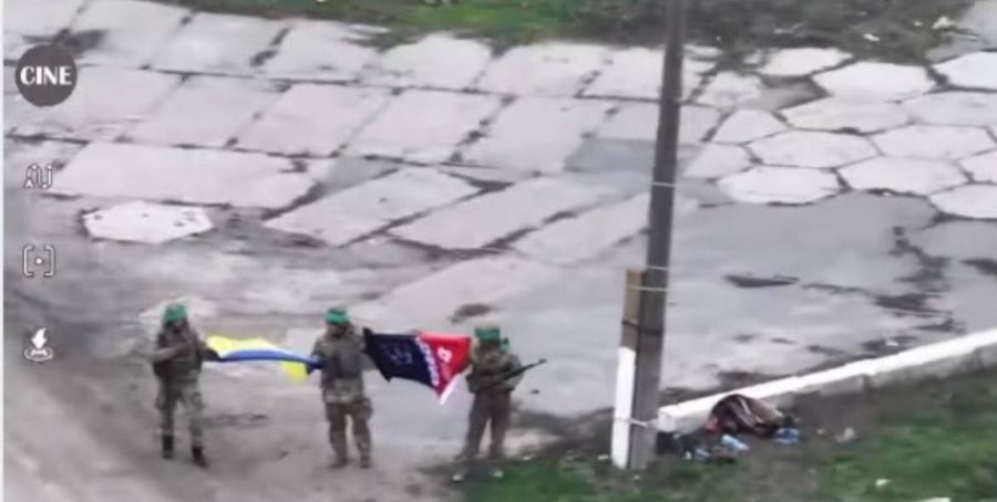 Бійці 67 ОМБр тримають синьо-жовтий стяг у деокупованому селі Тихе на Дніпропетровщині. Скриншот із відео