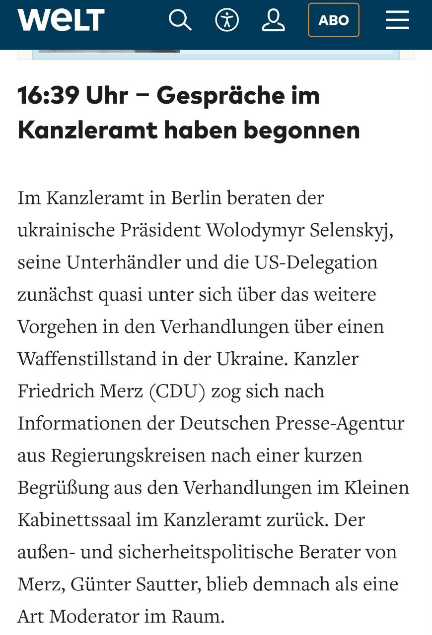 На встрече также присутствовал канцлер ФРГ Фридрих Мерц. Он занимал место за столом на стороне украинской делегации, однако, по данным газеты Die Welt, досрочно покинул переговоры.