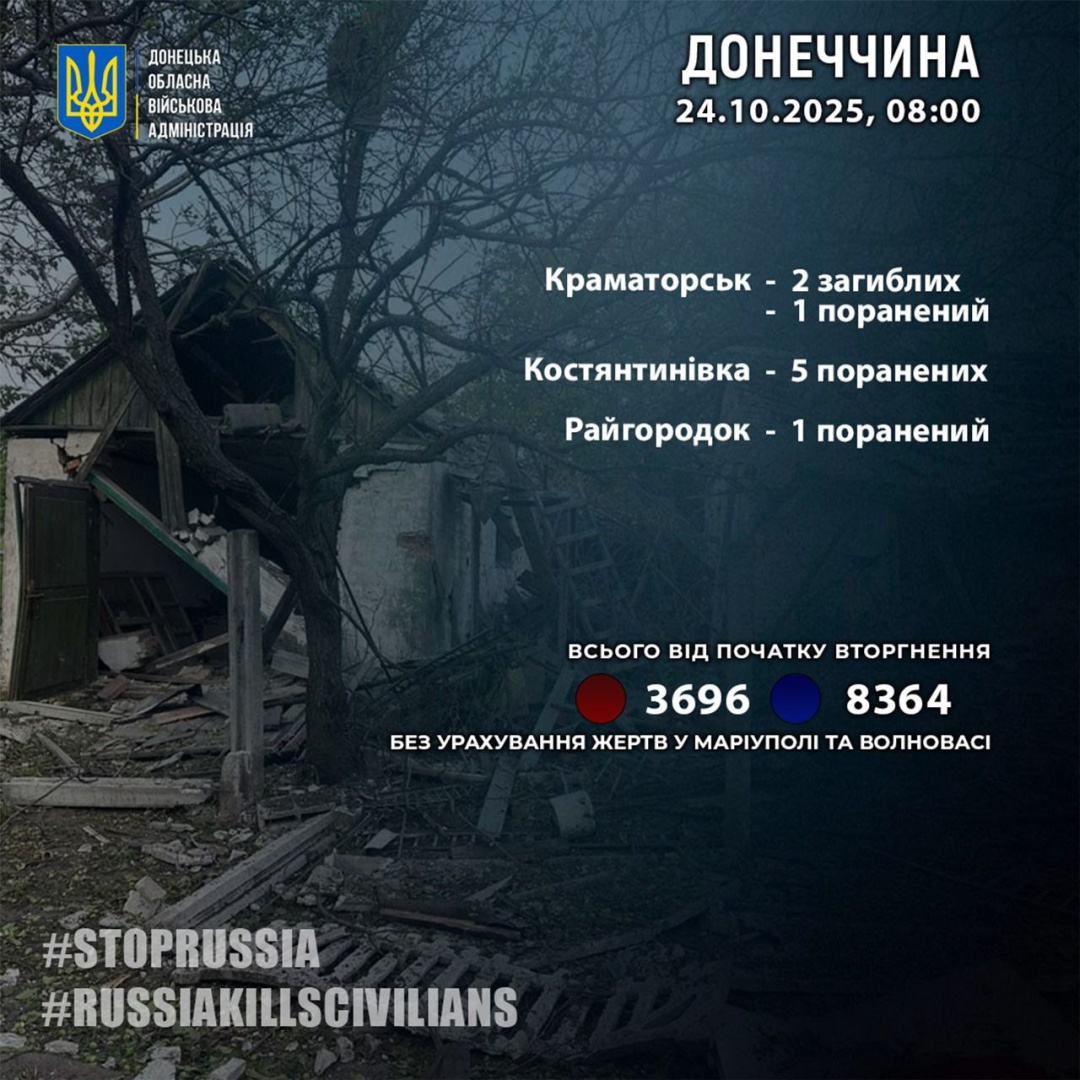 У Донецькій області російські війська минулої доби, 23 жовтня, вбили двох та поранили сімох цивільних.