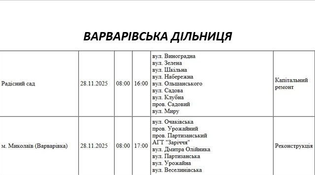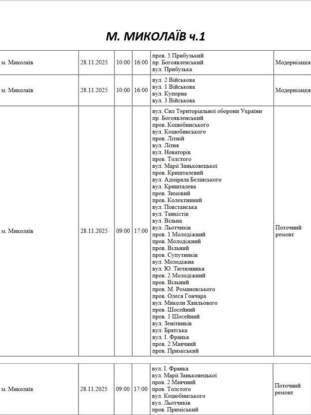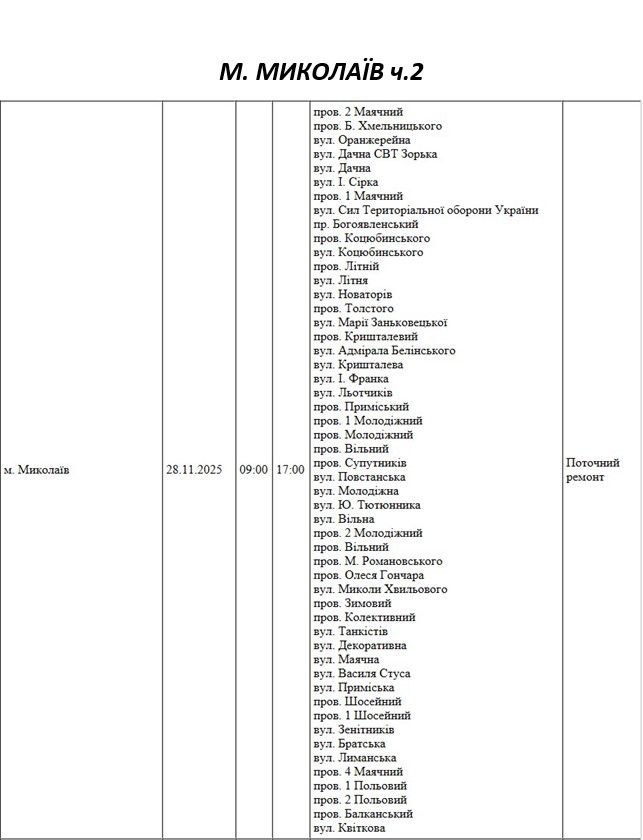 Внимание! 28 ноября в Николаеве и области запланированы отключения света из-за ремонтных работ. Адреса