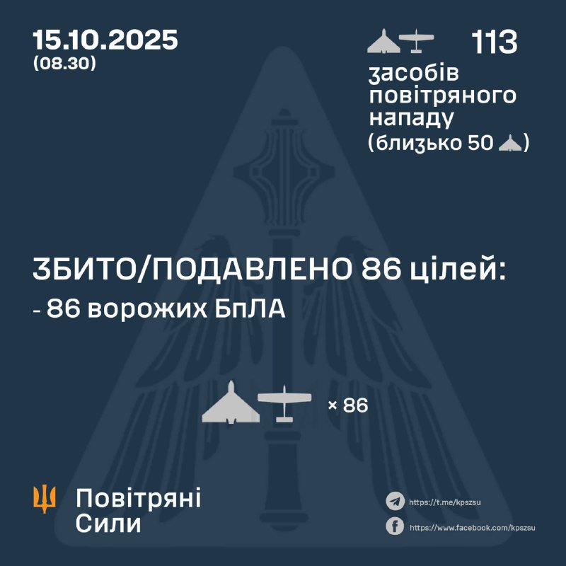 У ніч на 15 жовтня російські війська атакували Україну 113 ударними безпілотниками. ППО знешкодила 86 із них.