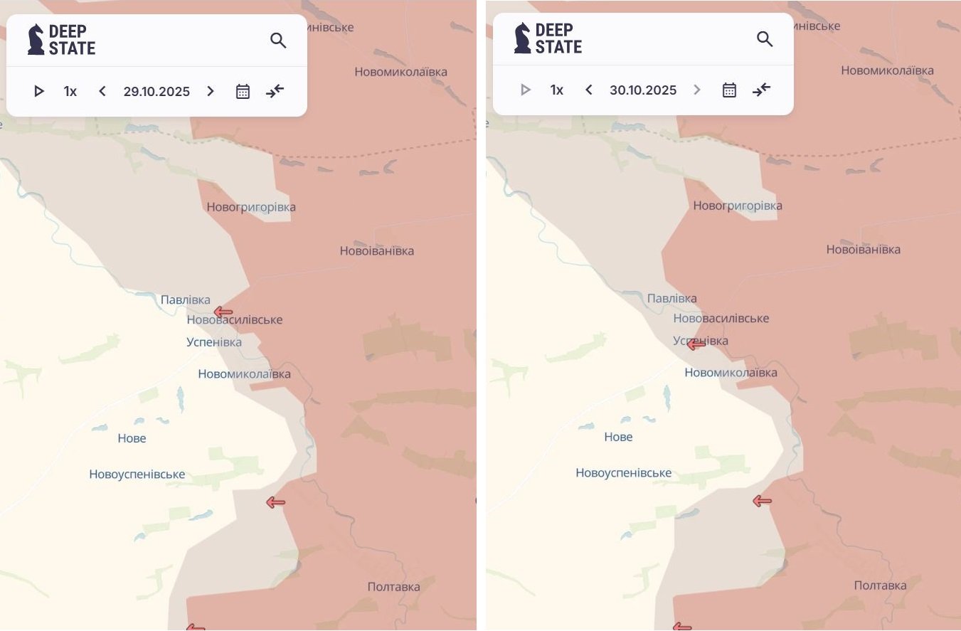 Противник просунувся у Покровську Донецької області, а також в Успенівці, Новомиколаївці та в районі Новогригорівки Запорізької області. Про це повідомив OSINT-проєкт DeepState 31 жовтня.