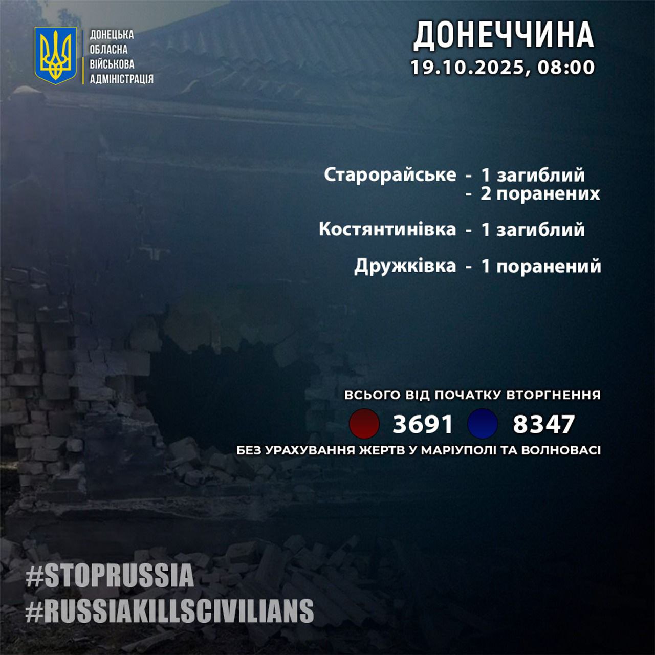 За добу 18 жовтня росіяни вбили та поранили 5 цивільних Донецької області.